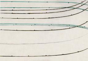 Es sind grundierte Sperrholzplatten, im Format 22,5 x 31,5 cm, auf die mit Pinsel und Gouache Linien von links nach rechts gezogen sind. Die Linien sind gekrümmt. Sie schneiden die linke oder rechte Schnittkante des Formats in einer nach oben oder nach unten verlaufenden Kurve. Die Linien sind farbig und stehen in unterschiedlichen Abständen zueinander. Sie haben in etwa die gleiche Stärke und Länge. Reste einer Handschrift sind sichtbar. Die Linien werden in regelmäßigen Abständen von Punkten berührt, die ihnen eine rhythmische Struktur geben. Das Auge folgt der Krümmung der Linien mit seinen rhythmischen Intervallen. Die Linien kommen von außerhalb und gehen nach außerhalb des Bildes. Sie stellen eine Balance her zwischen Vorhandenem und Nichtvorhandenem.